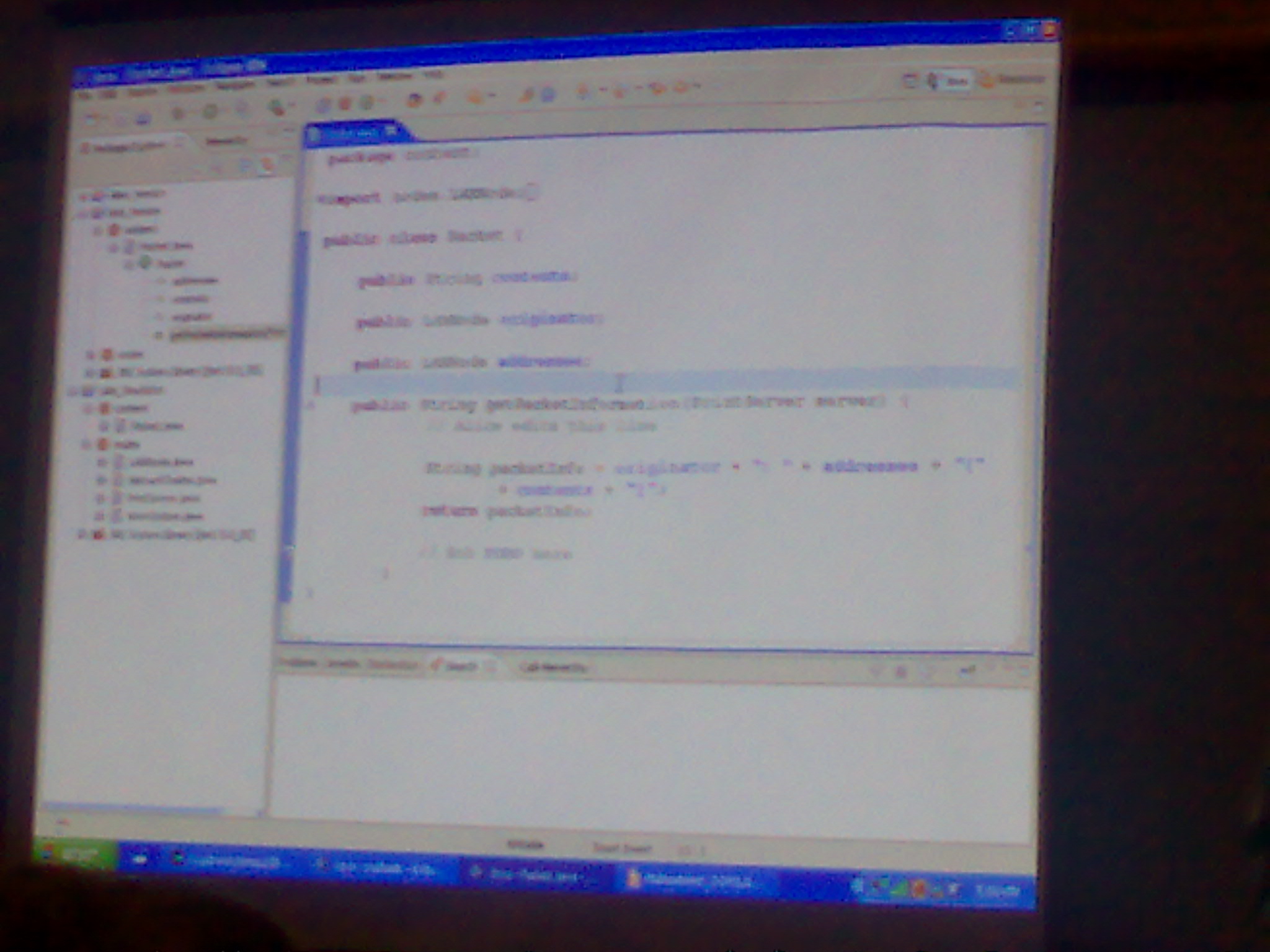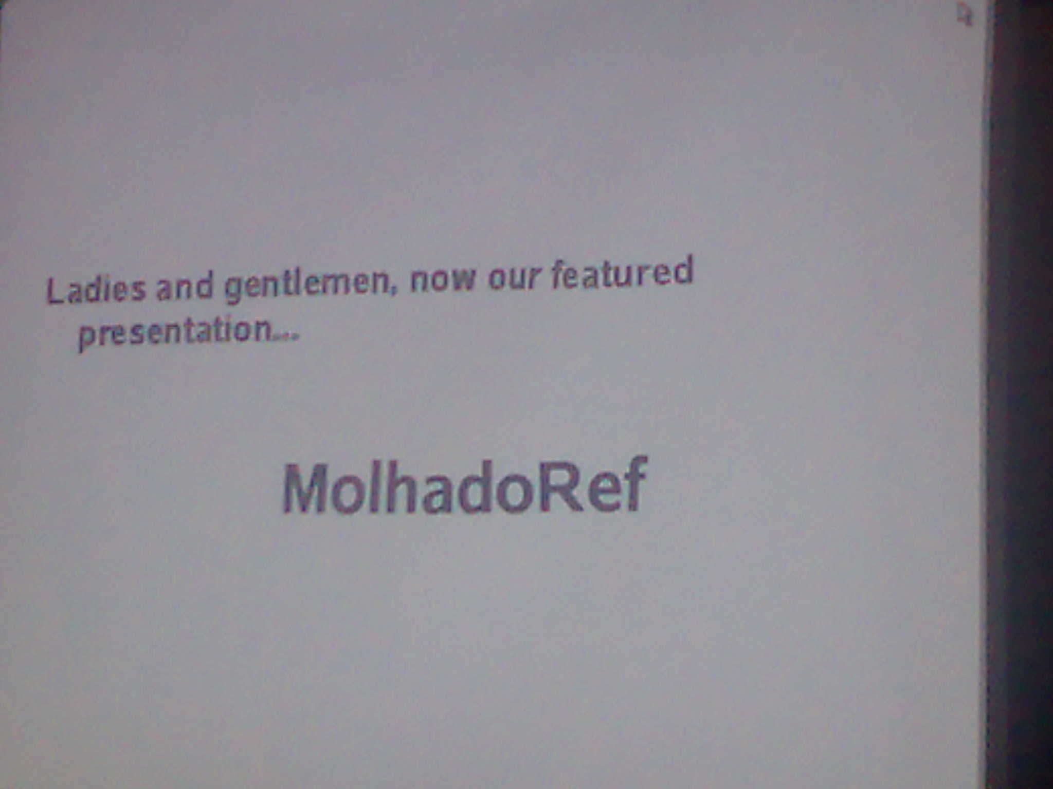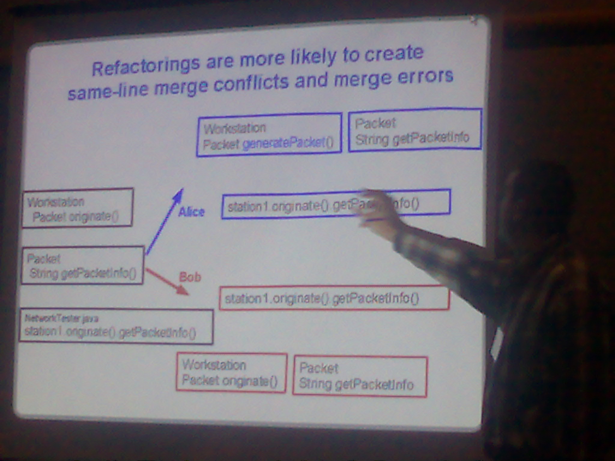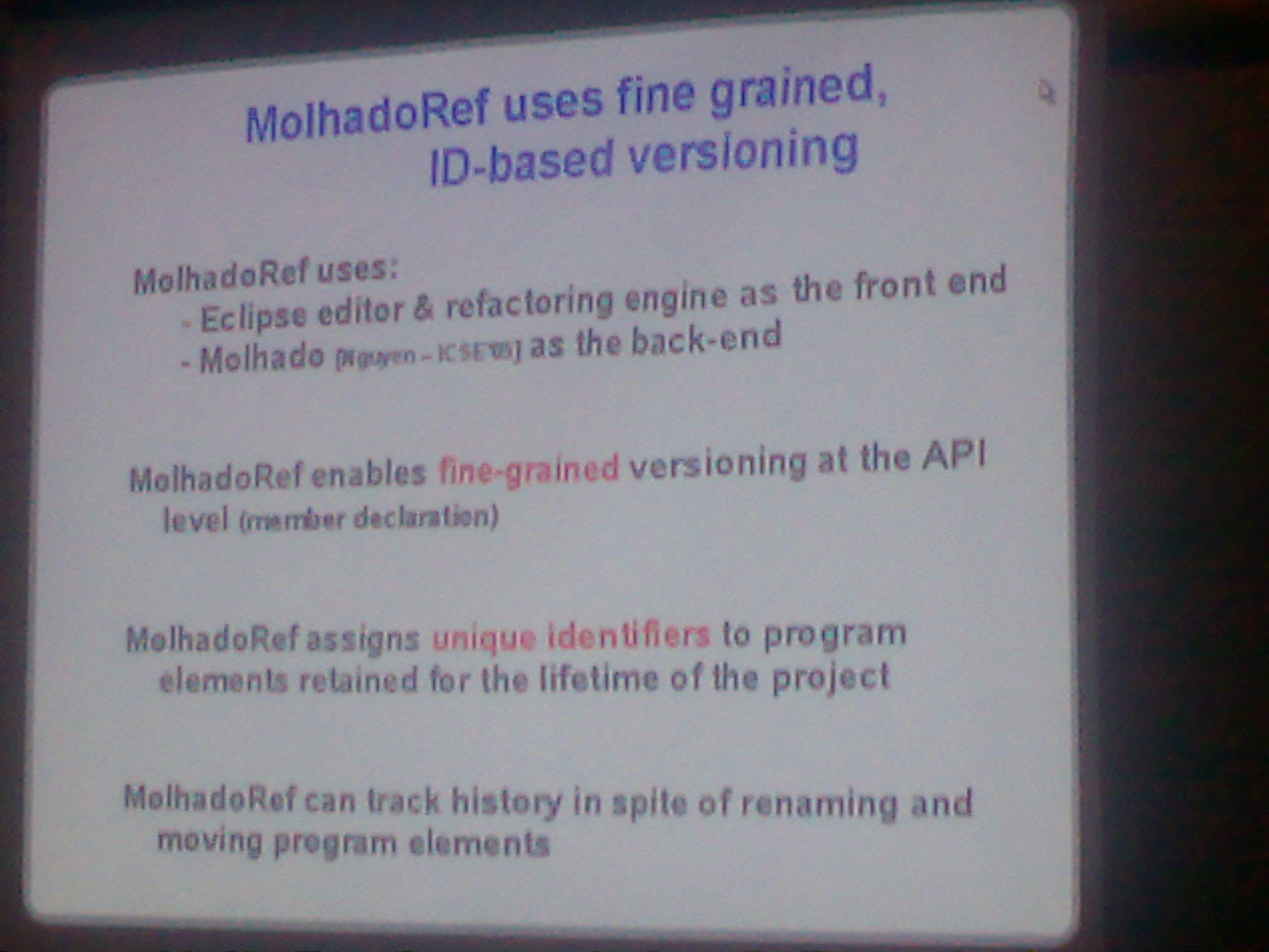 This demo was of a plugin for Eclipse for using the Molhadu source code repository. Instead of treating all files a s either text or binary, the MolhadoRef system knows about the structure of source code and can detect APIs and distinguish them from other source code. The system can then distinguish refactorings of the API from general code edits, and be much more efficient in automatically merging concurrent changes.